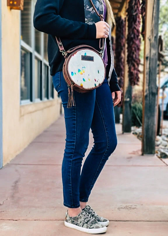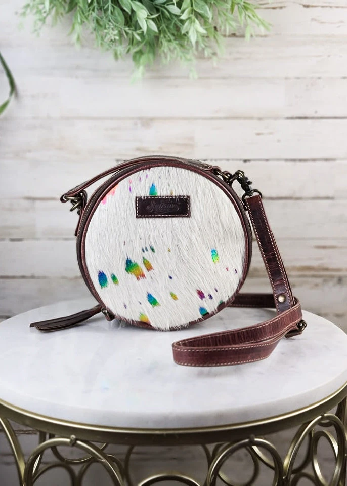 - Add a pop of color and uniqueness to your outfit with the Sixtease Rainbow Splatter Cowhide Round Handbag. Order now and elevate your style effortlessly.