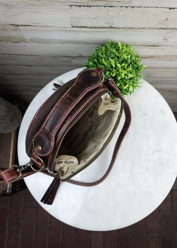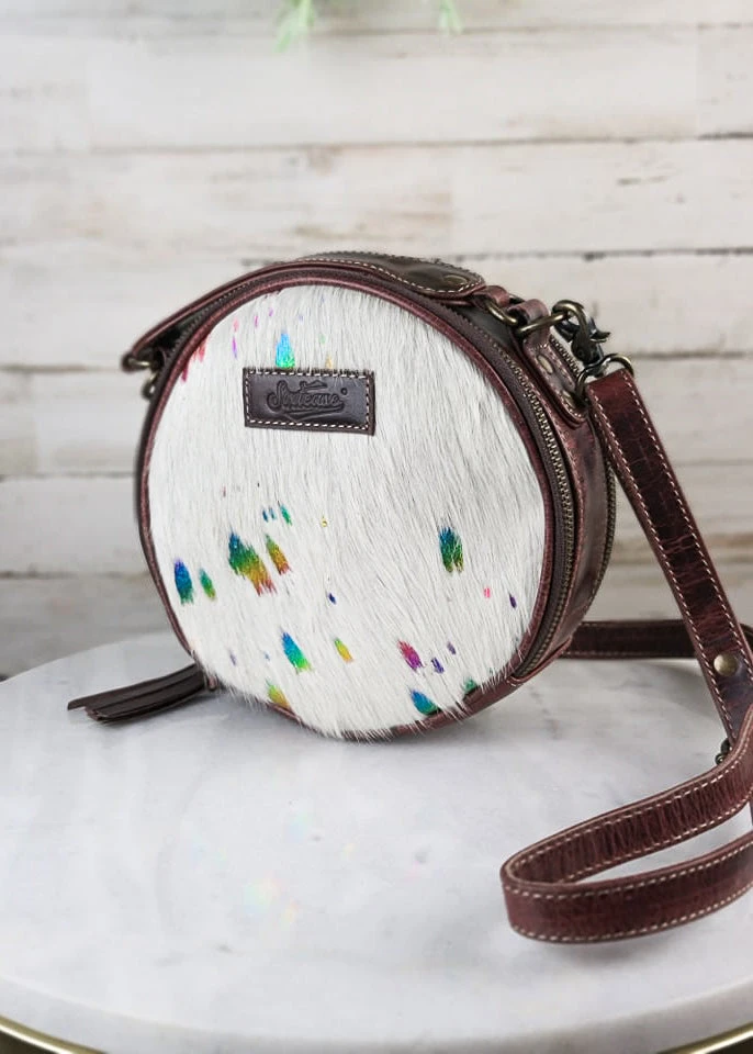 - The Sixtease Rainbow Splatter Cowhide Round Handbag features a vibrant, eye-catching design with a durable cowhide construction, making it both stylish and long-lasting.