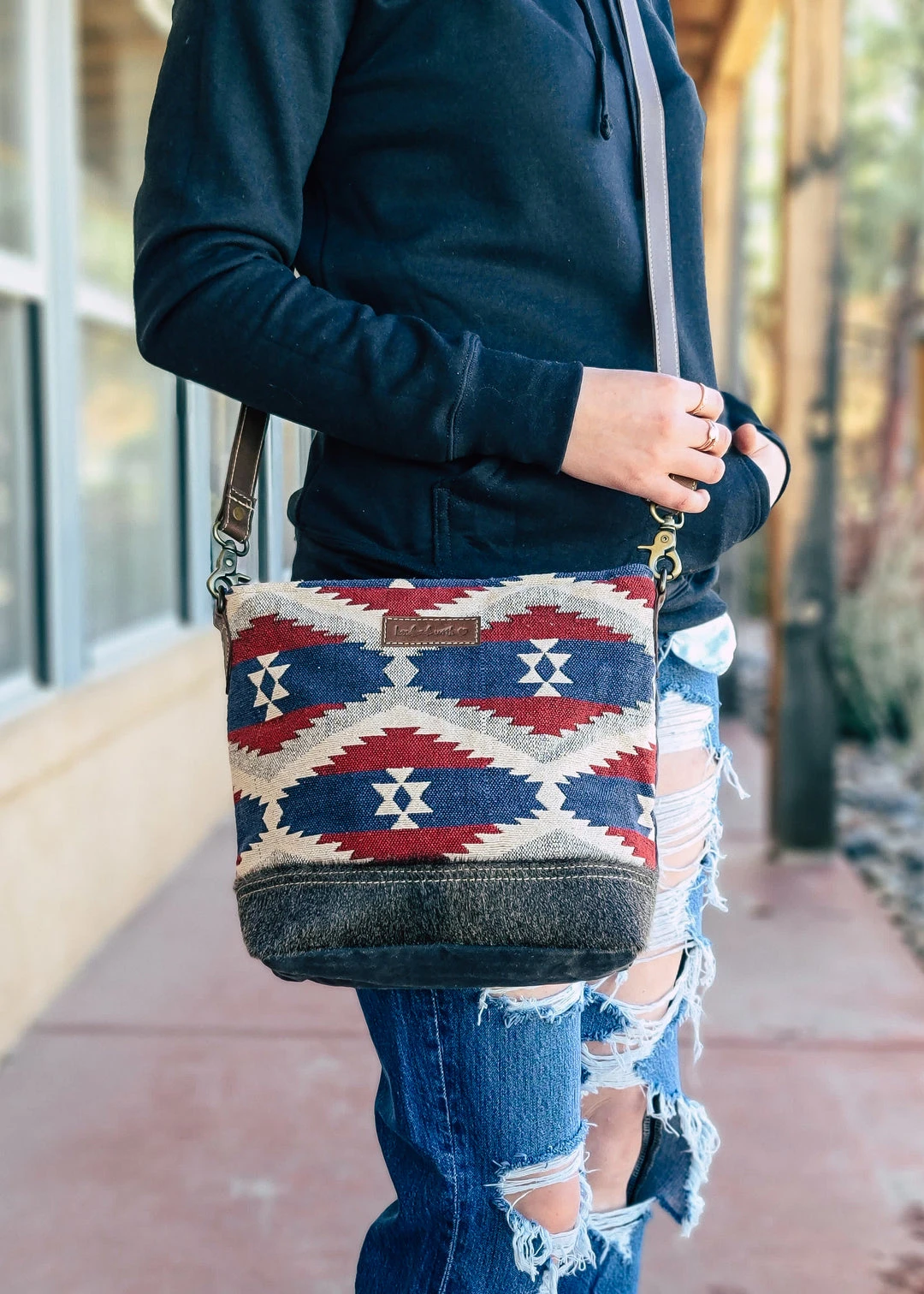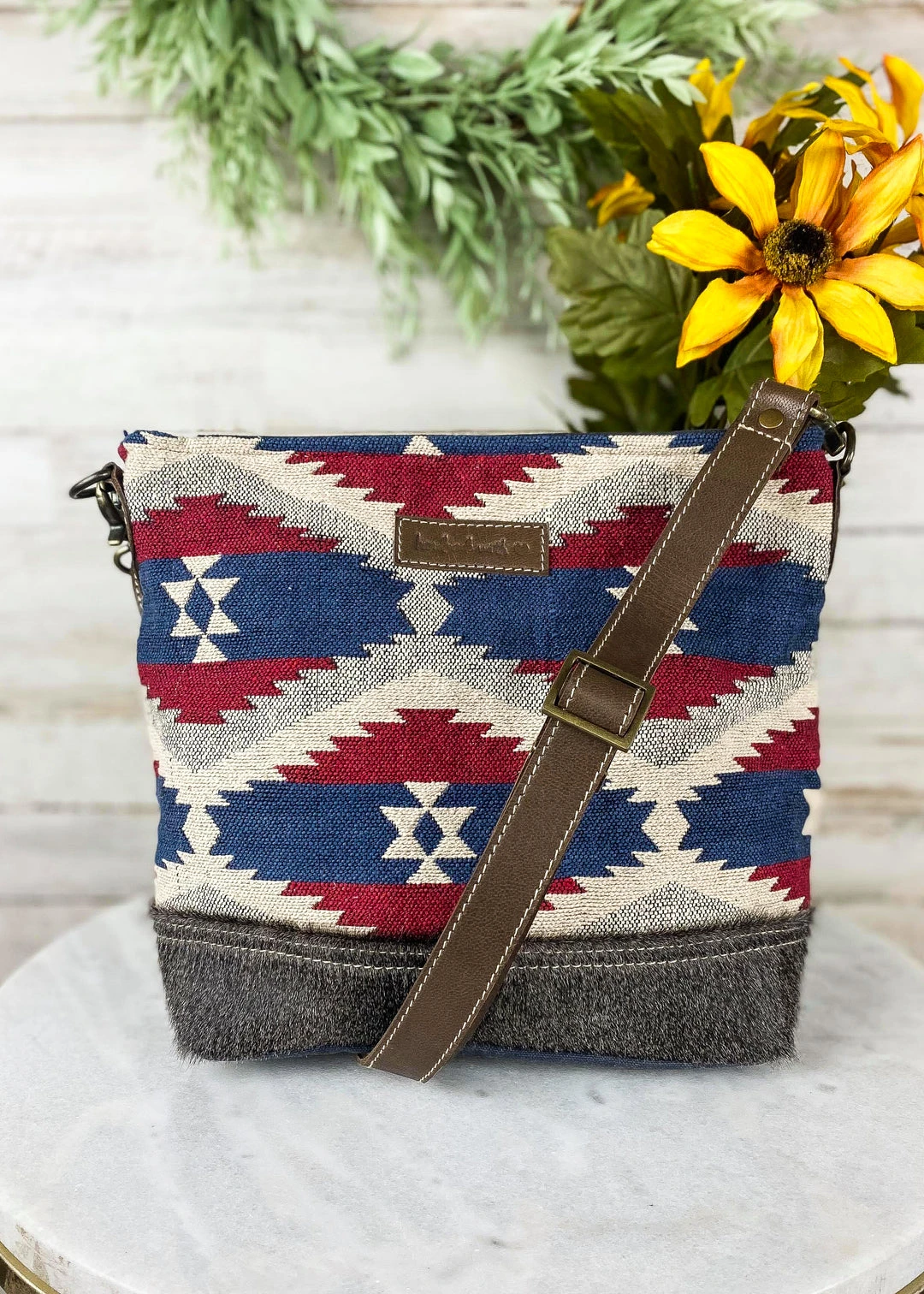 - Crafted with high-quality materials, this crossbody bag features a vibrant Aztec pattern in red and blue, making it a standout accessory for your wardrobe.