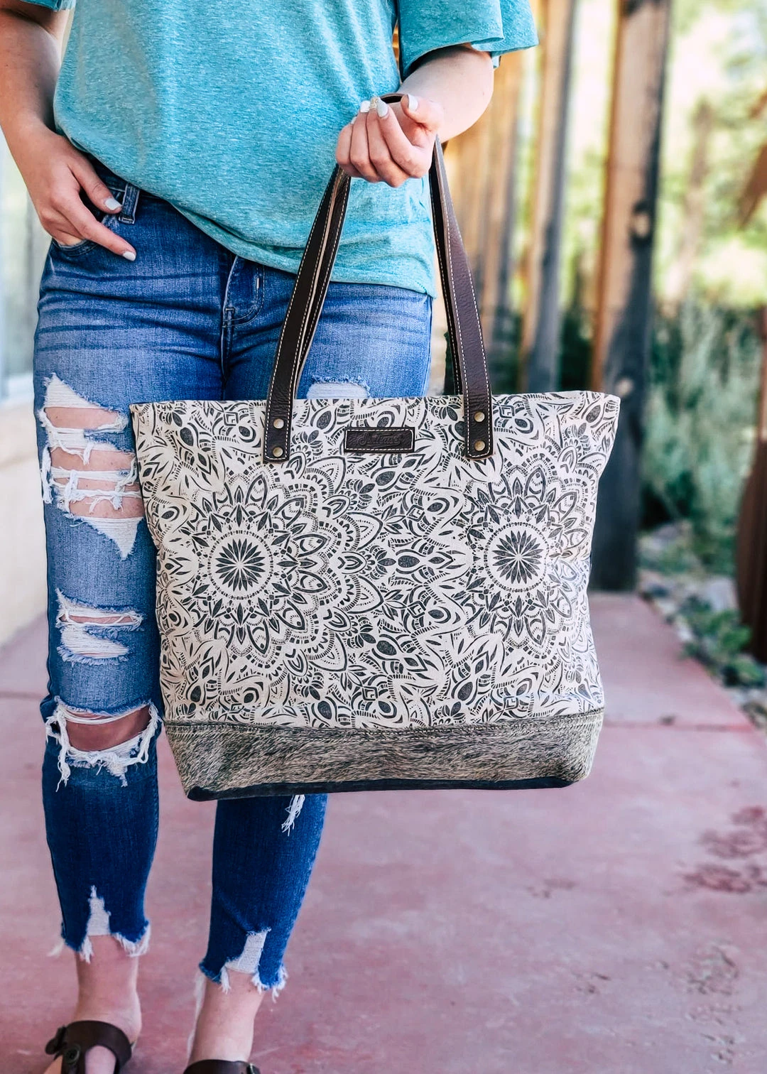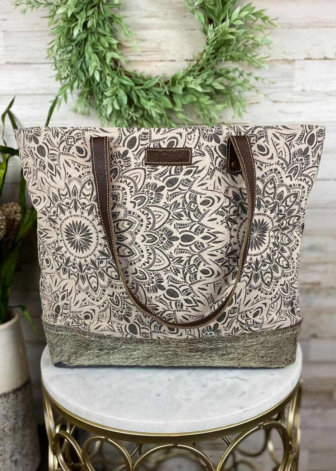 - Elevate your style with the Sixtease Abstract Floral & Cowhide Tote Handbag. This chic tote bag combines abstract floral patterns with luxurious cowhide for a unique and fashionable look.