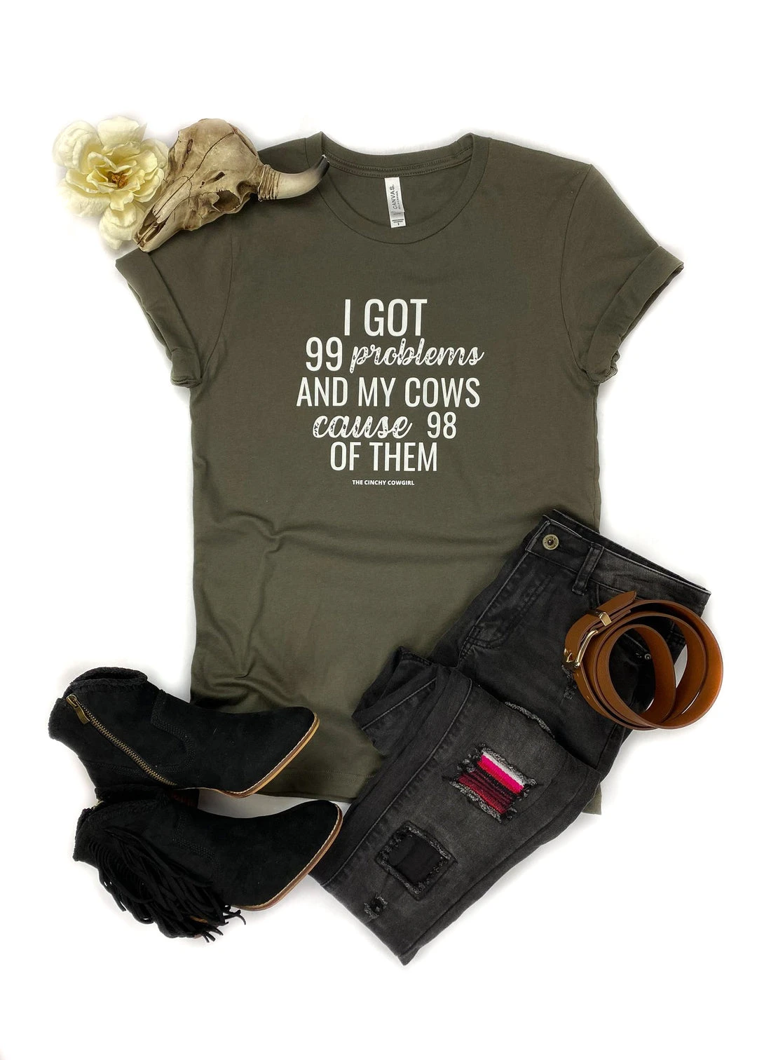 - Show off your unique style with The Cinchy Cowgirl Army Green Problem Cows Short Sleeve Tee. This graphic tee features a bold and playful design that’s perfect for casual outings or everyday wear.
