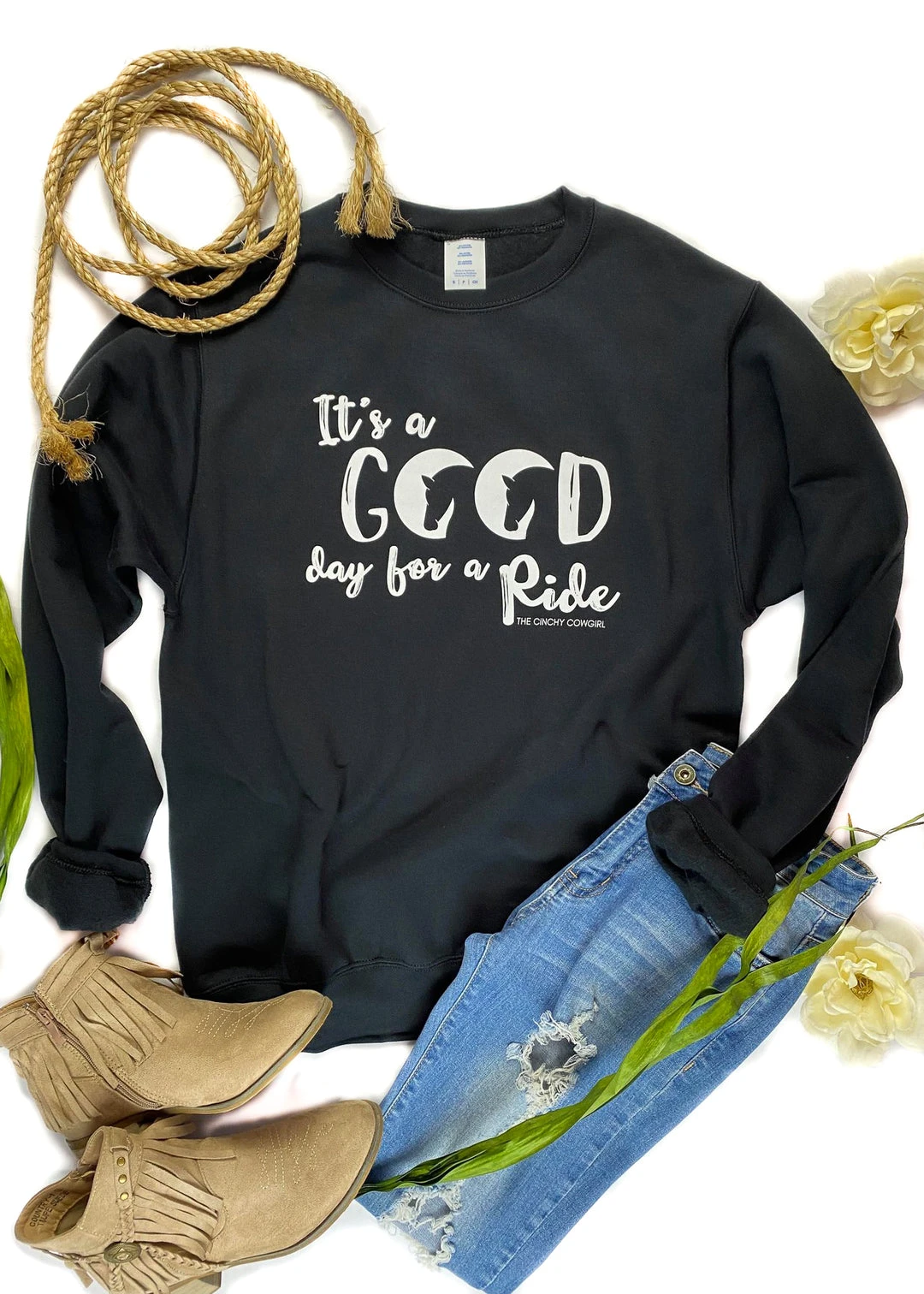 - Enjoy hassle-free shopping with our secure payment options and fast, reliable shipping. Add The Cinchy Cowgirl Black Good Day For A Ride Sweatshirt to your cart today and experience the perfect blend of style and comfort!