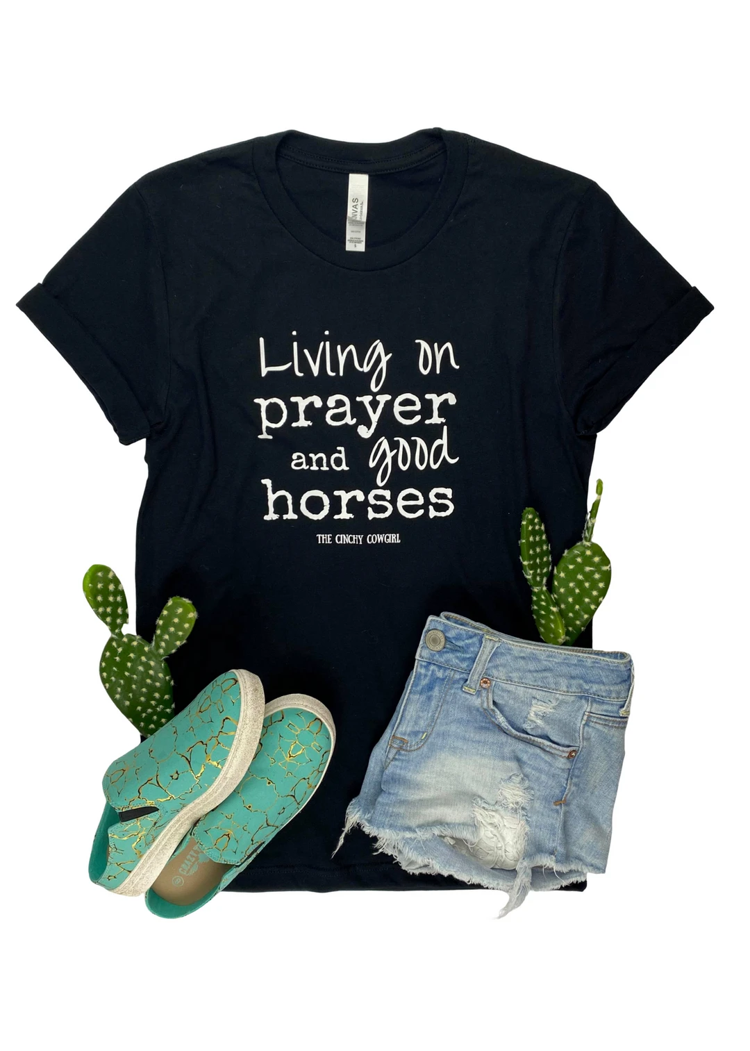 - Elevate your casual wardrobe with The Cinchy Cowgirl Black Living On Prayer Short Sleeve Graphic Tee. This stylish tee features a unique graphic design that adds a touch of personality to your look.