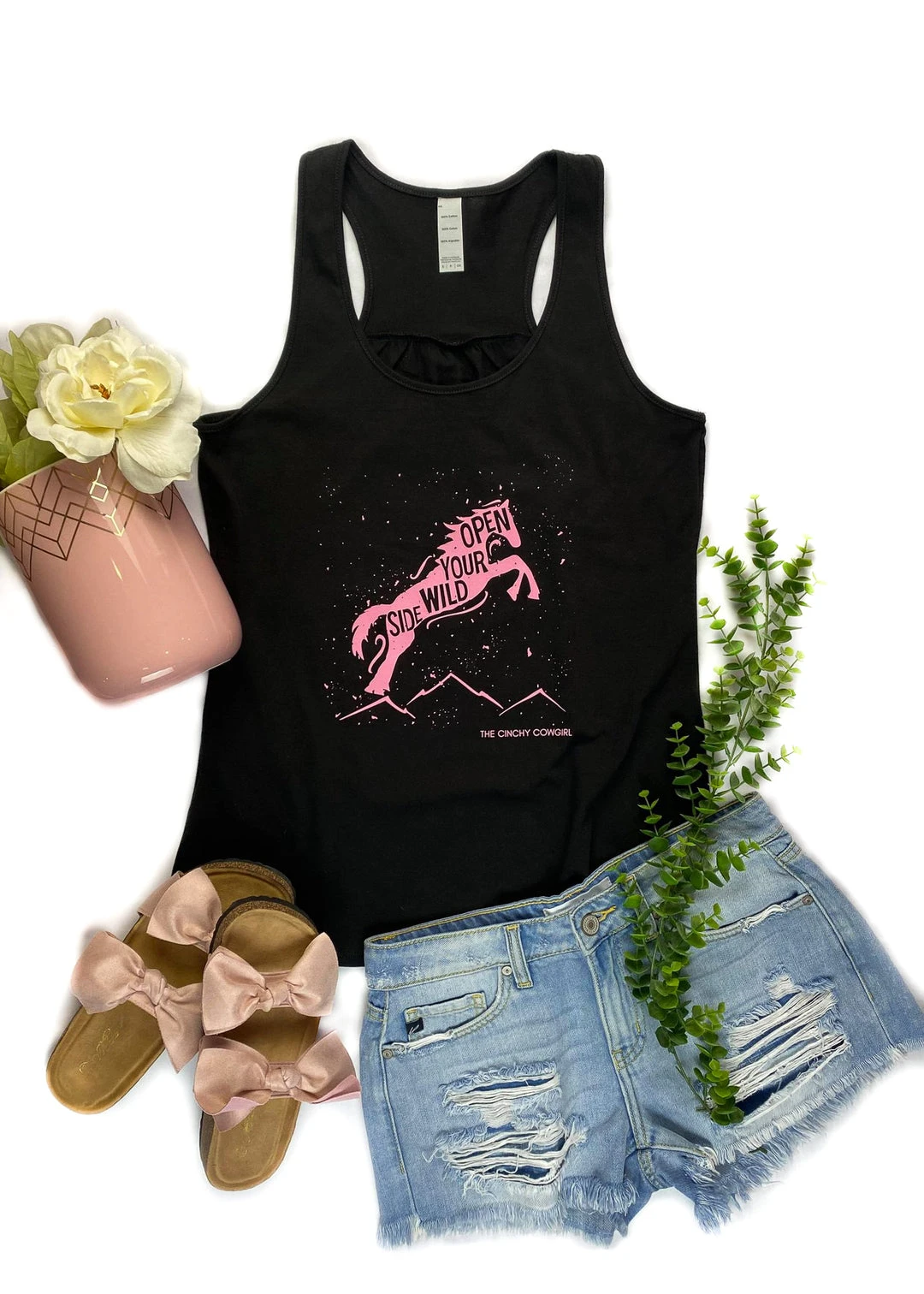 - Unleash your inner cowgirl with The Cinchy Cowgirl Black Open Your Wild Side Tank. This graphic tank top features a striking design that’s perfect for casual outings, festivals, or just lounging around.