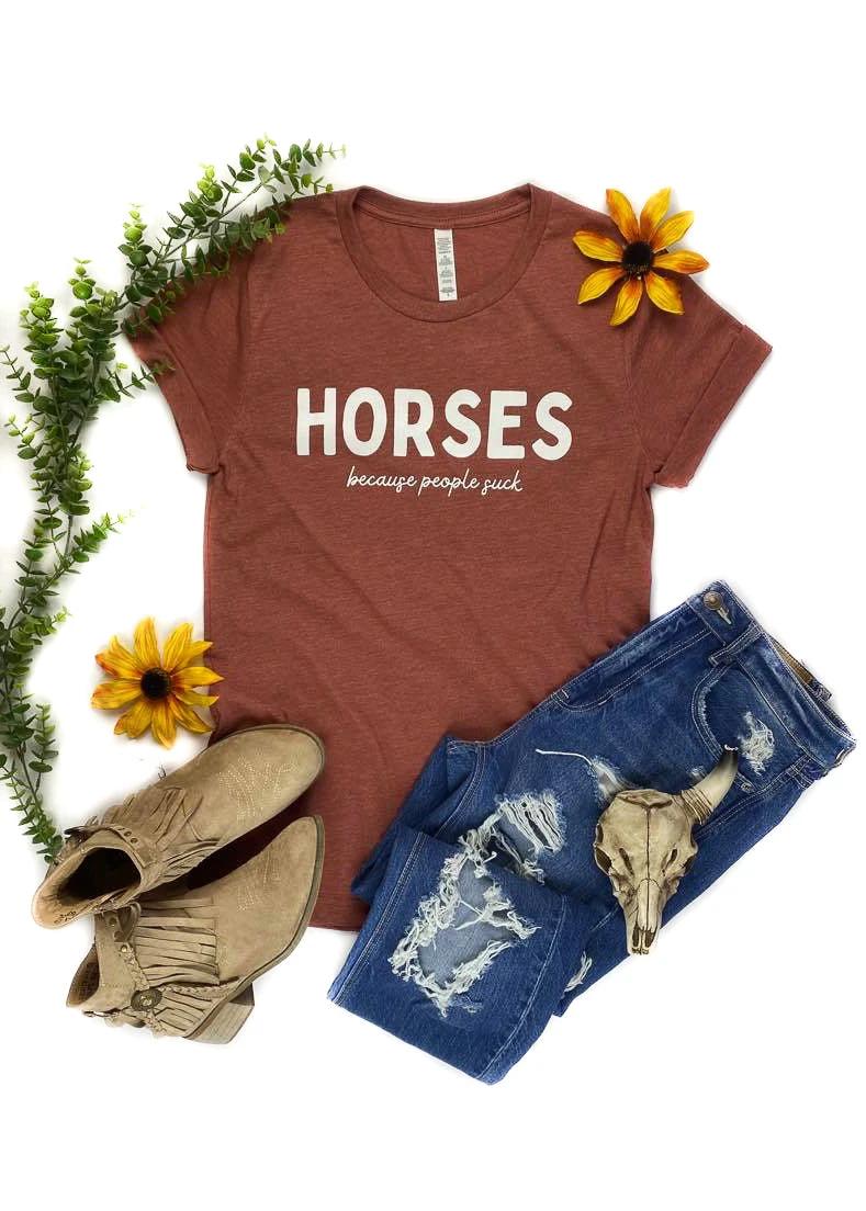 - Express your unique style with The Cinchy Cowgirl Clay Horses Because People Suck Short Sleeve Graphic Tee. This eye-catching design is perfect for those who love bold and humorous fashion statements.