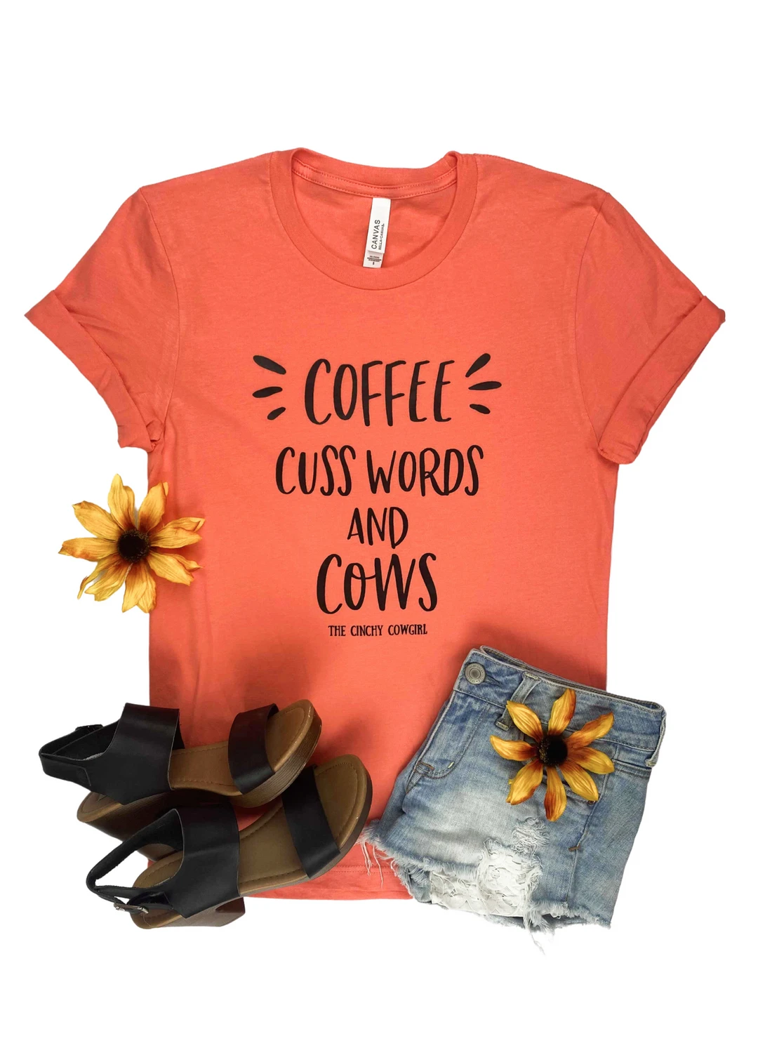 - Show off your unique style with The Cinchy Cowgirl CLOSEOUT Coral Coffee, Cuss Words & Cows Short Sleeve Graphic Tee. This bold and humorous design is perfect for casual outings or themed events.