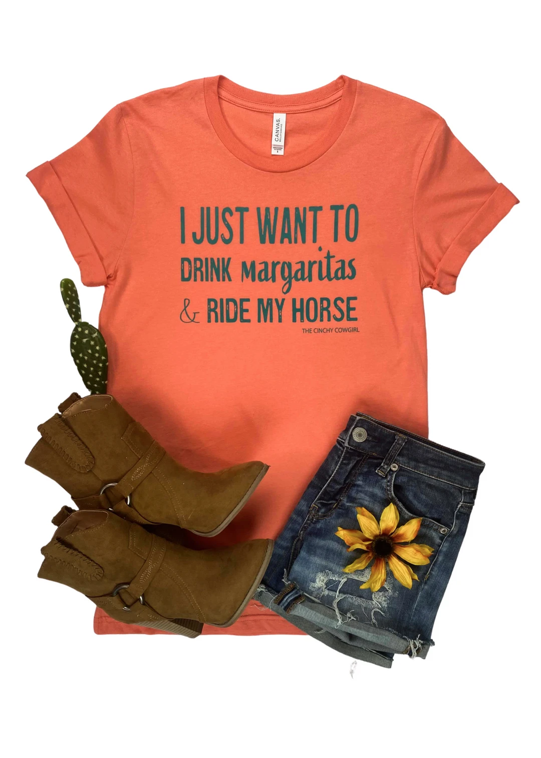 - Express your unique style with The Cinchy Cowgirl Coral Drink Margaritas & Ride My Horse Graphic Short Sleeve Tee. This eye-catching tee features a bold design that’s perfect for any casual occasion.
