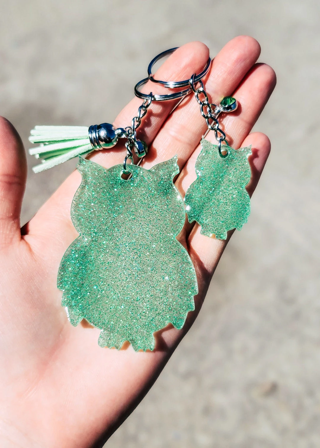 - Handcrafted with precision, these resin keychains feature a vibrant green owl design paired with a mini companion, making them a delightful set of 2.