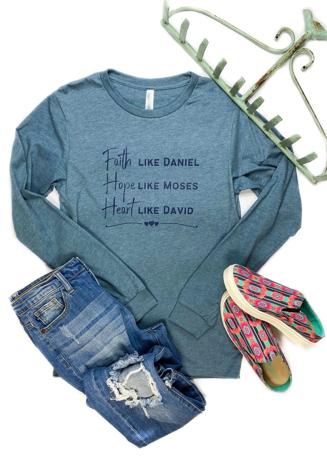 - Showcase your faith and style with The Cinchy Cowgirl Heather Slate Faith Hope Heart Long Sleeve Graphic Tee. This comfortable and stylish tee is perfect for casual outings or cozy days at home.