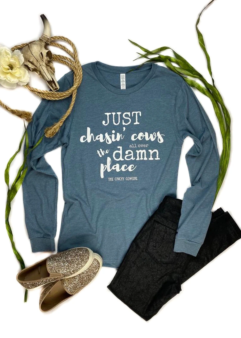 - Show off your cowgirl spirit with The Cinchy Cowgirl Heather Slate ‘Just Chasin’ Cows’ Long Sleeve Graphic Tee. This stylish and comfortable tee is perfect for any casual occasion.