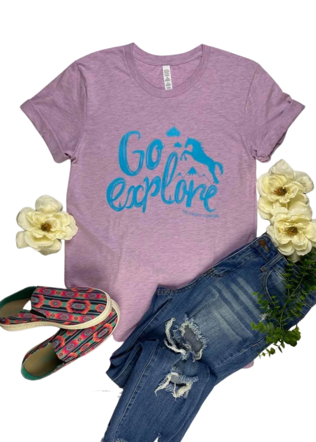 - Stay stylish and comfortable with The Cinchy Cowgirl Lilac Go Explore Short Sleeve Tee. This women’s graphic tee is crafted from soft, breathable fabric, making it perfect for everyday wear.