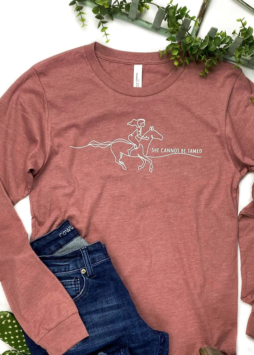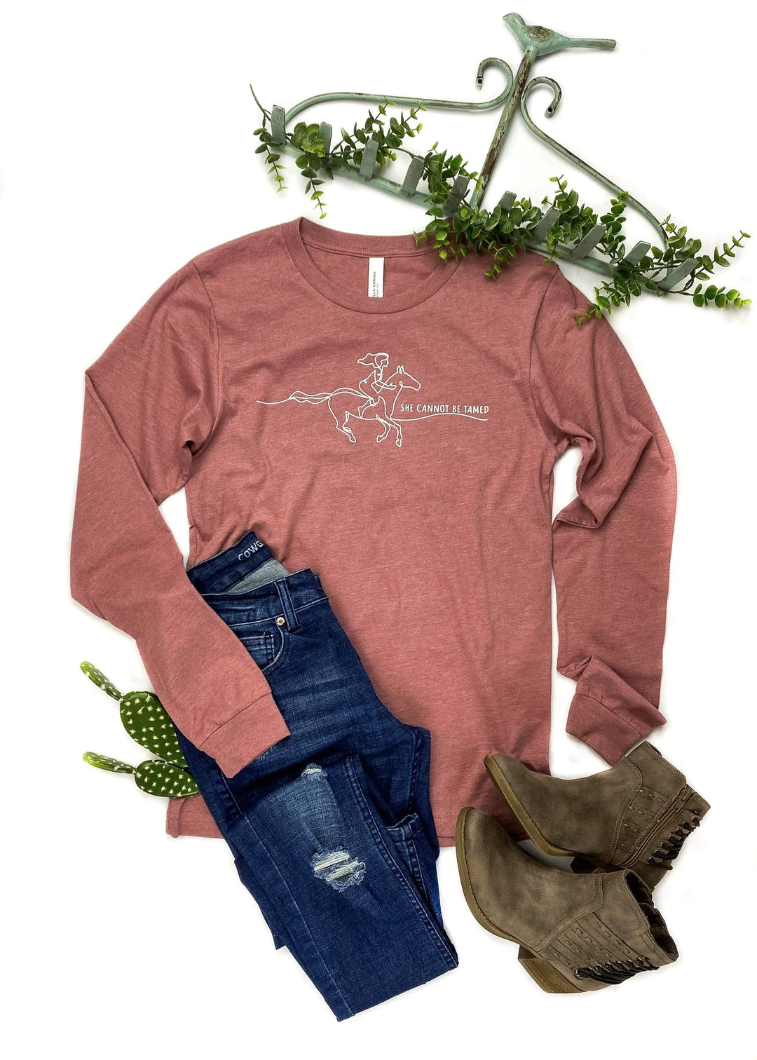 - Make a bold statement with The Cinchy Cowgirl Mauve ‘She Cannot Be Tamed’ Long Sleeve Graphic Tee. This unique design is perfect for those who love to stand out.