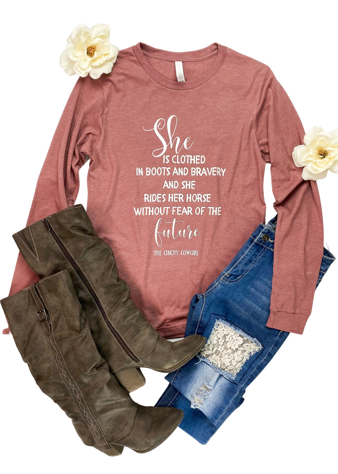 - Enjoy fast and reliable shipping with secure payment options. Add The Cinchy Cowgirl Mauve ‘She Is Clothed’ Long Sleeve Graphic Tee to your cart today and elevate your wardrobe with this fashionable and meaningful piece.