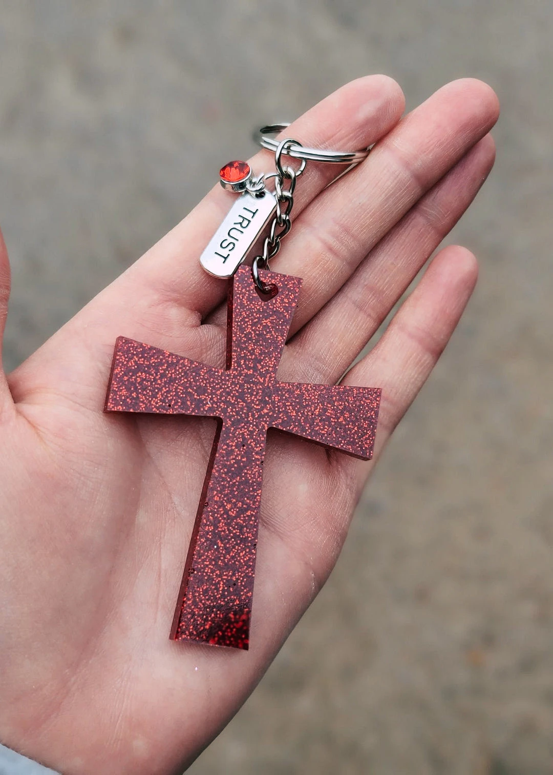 - The Cinchy Cowgirl Red Trust Cross Keychain is a beautifully crafted resin accessory, featuring a vibrant red cross design that symbolizes trust and faith. Perfect for adding a touch of elegance to your keys or bag.
