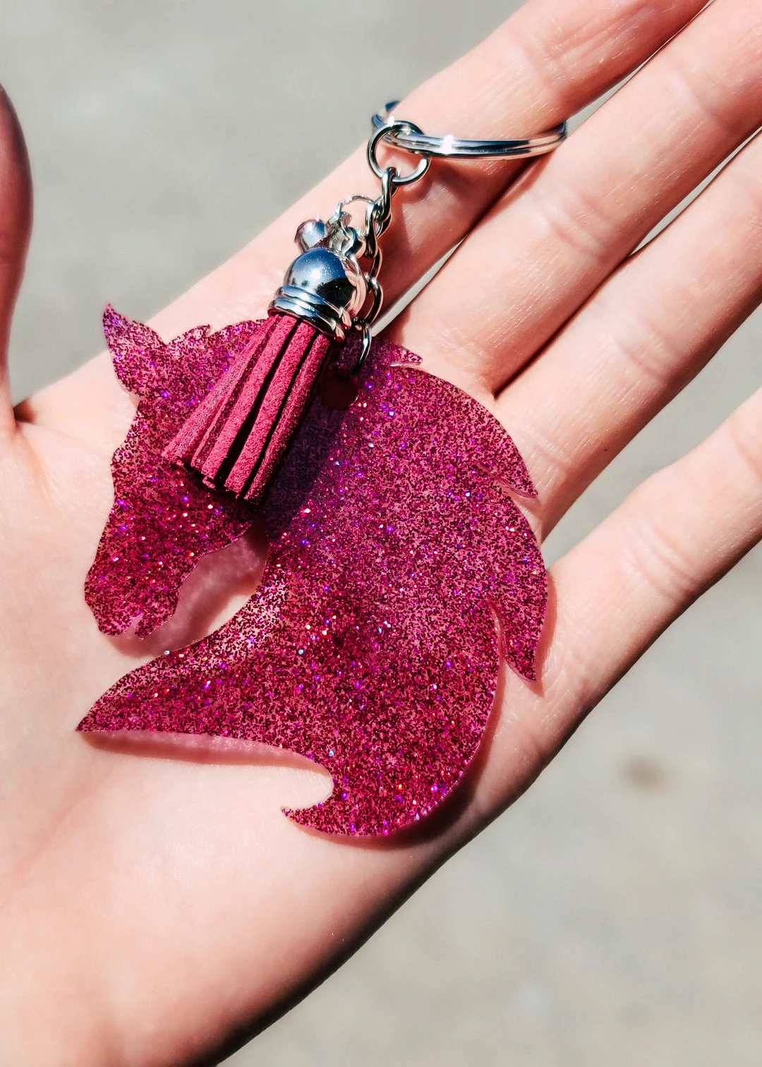 - Crafted with high-quality resin, this Dark Pink Horse Keychain features a detailed cowgirl design, ensuring durability and a polished look.