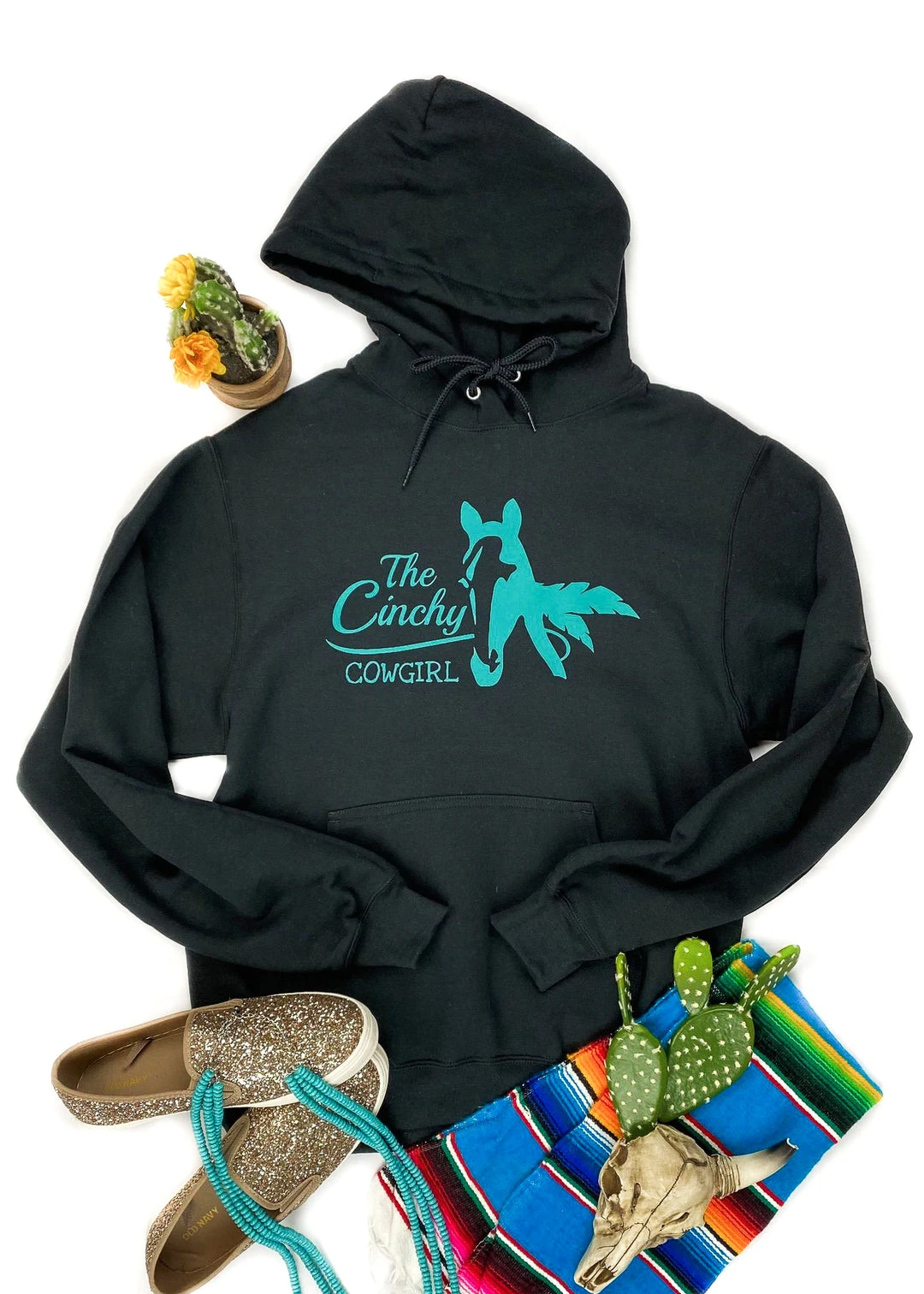 - Explore the rugged elegance with The Cinchy Cowgirl TCC Logo Gear Unisex Hoodie, featuring a striking black and teal color scheme that stands out.