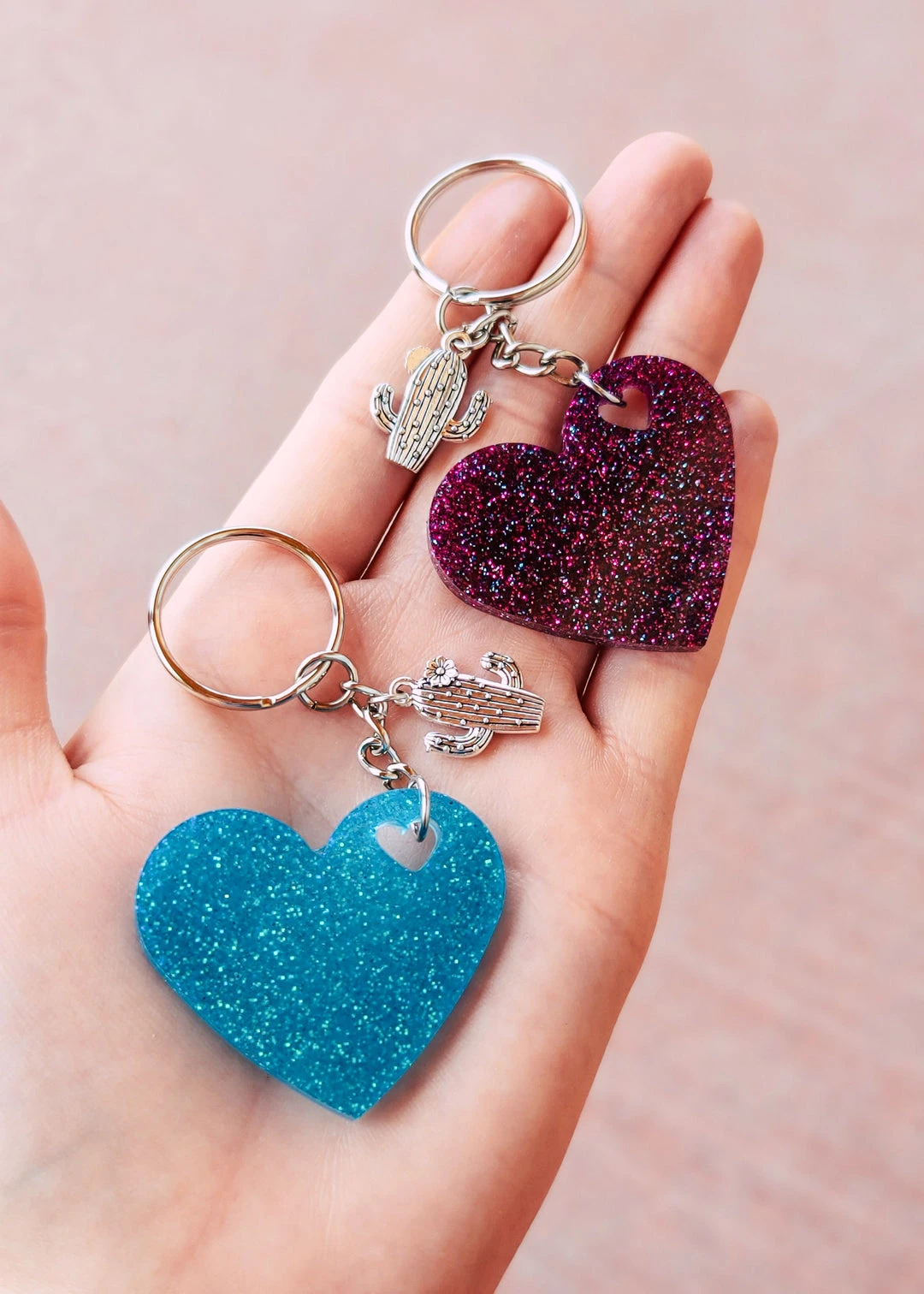 - Each keychain in this set is uniquely designed with a heart shape, showcasing a beautiful blend of turquoise and magenta hues, adding a touch of elegance to your everyday essentials.