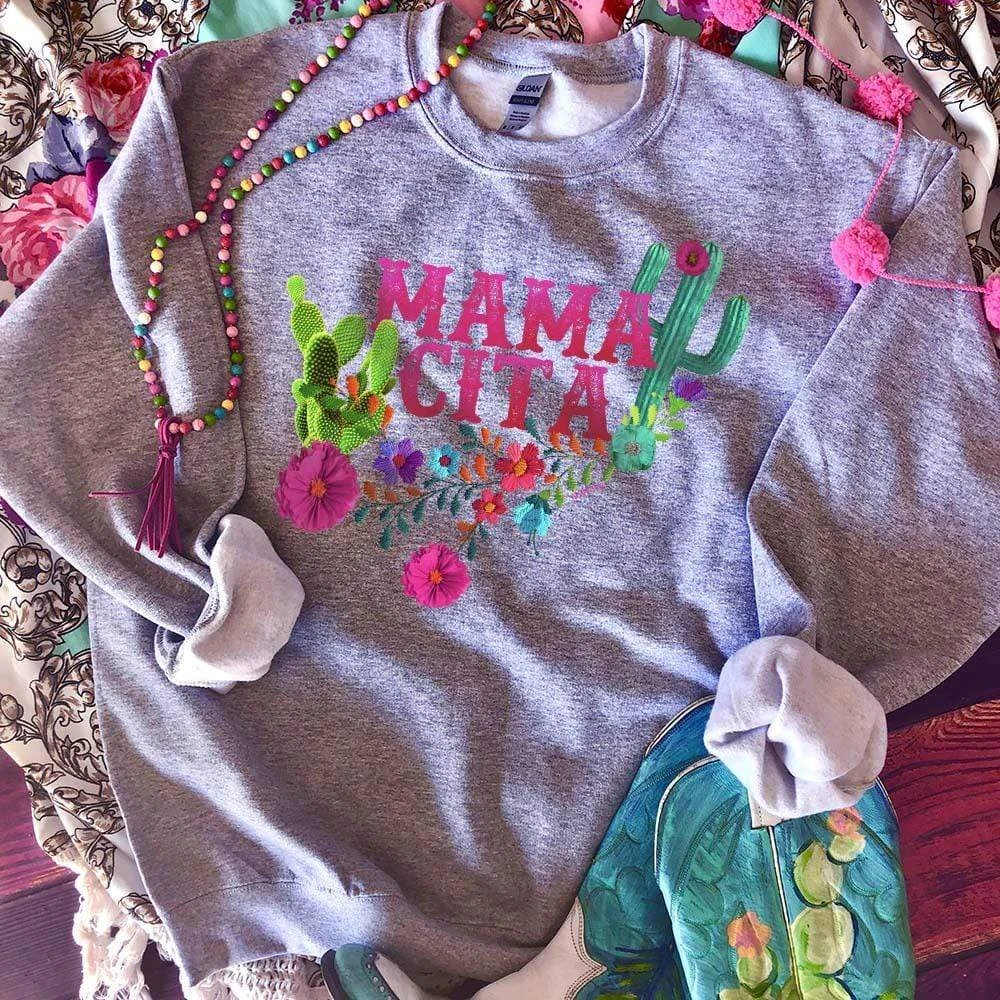 - Elevate your casual wardrobe with Thelattimoreclaim Gray Mamacita Sweatshirt, featuring a unique graphic design for a trendy look.