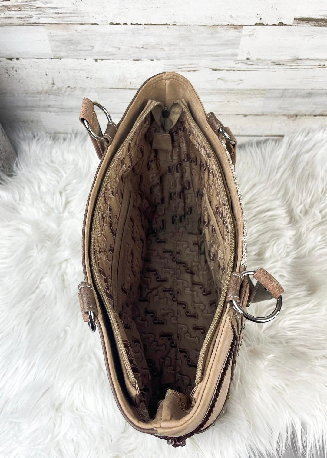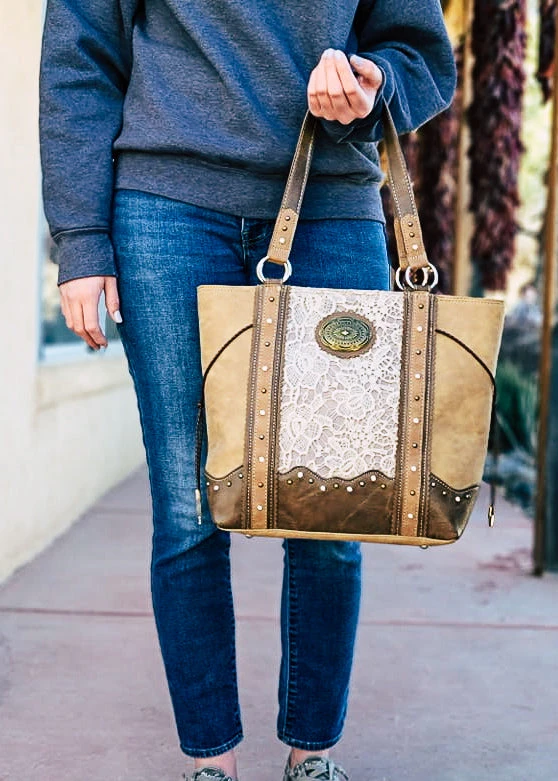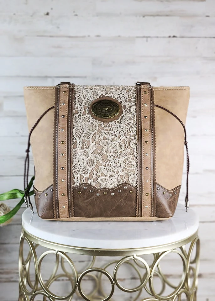 - Stay stylish and secure with the Trenditions Concealed Carry Tan & Lace Handbag. This elegant tote bag features a concealed carry compartment, making it perfect for everyday use.