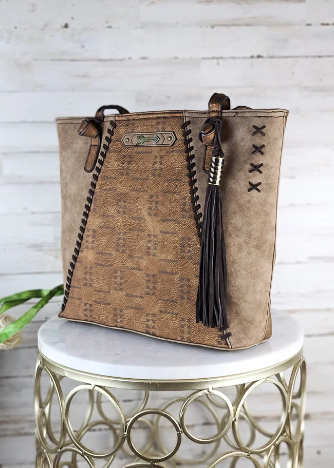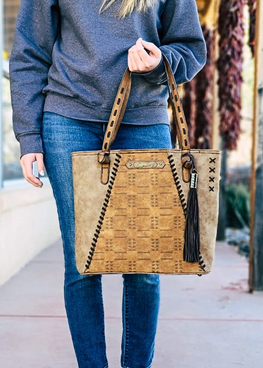 - Stay stylish and secure with the Trenditions Concealed Carry Zoey Aztec Tote Handbag. Featuring a unique Aztec design, this tote is perfect for any occasion.