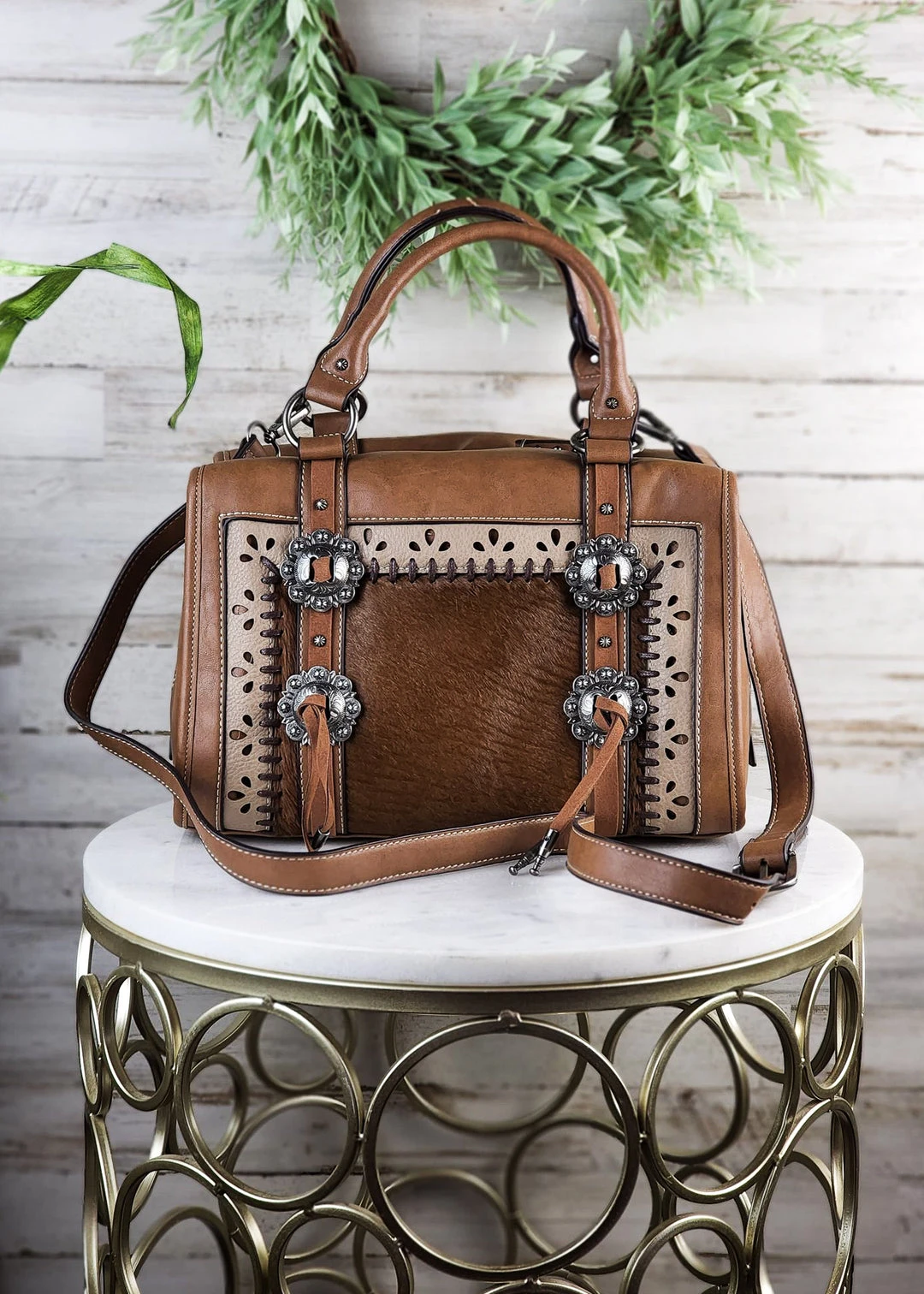 - Elevate your style with the Trenditions Concho Hair On Hide Satchel Handbag. This unique crossbody bag features a genuine hair-on-hide design with intricate concho details, making it a standout accessory for any outfit.