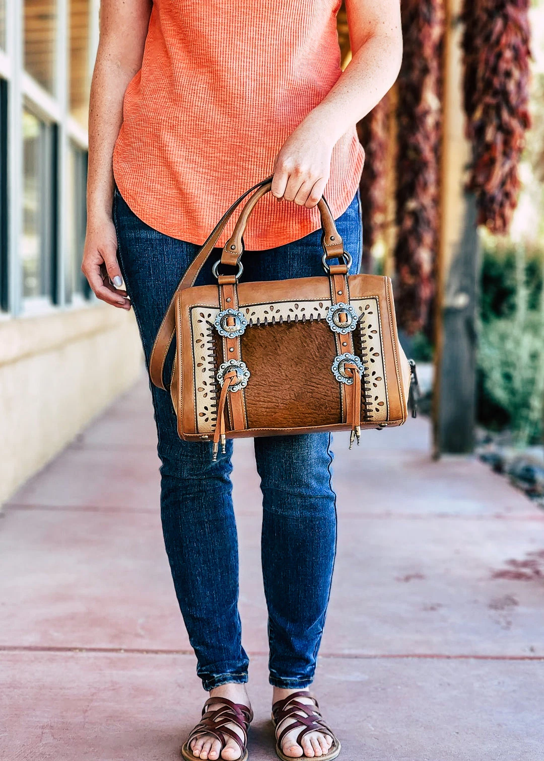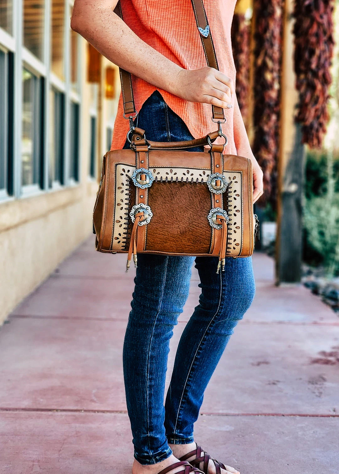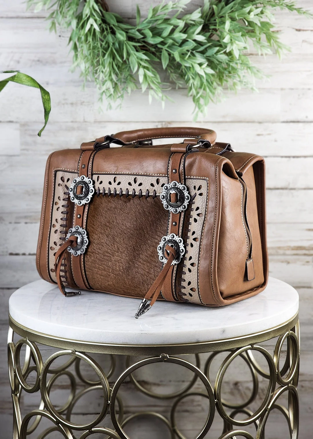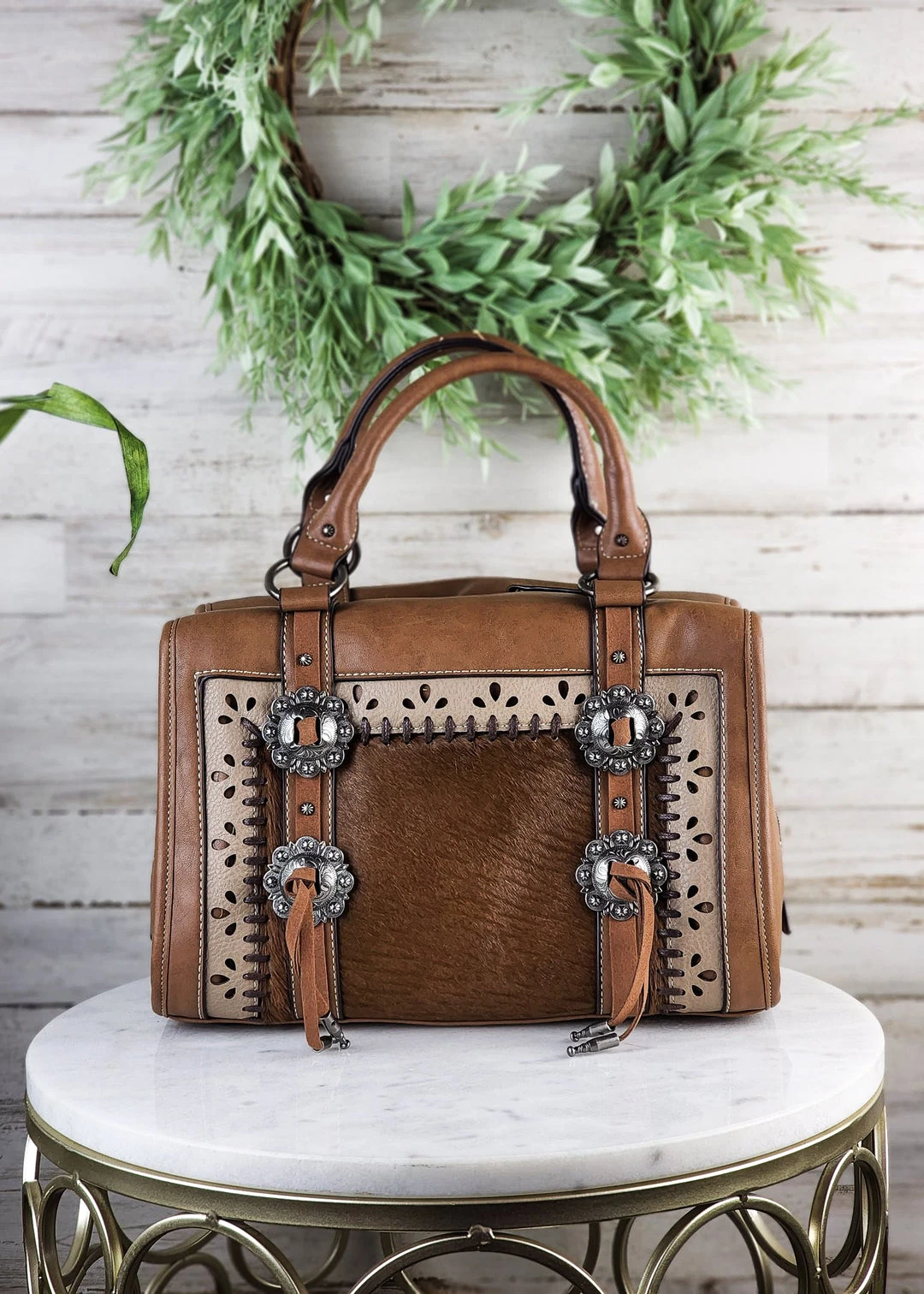 - Add the Trenditions Concho Hair On Hide Satchel Handbag to your collection today and experience the perfect blend of style, comfort, and practicality. Order now and receive free shipping on all orders!